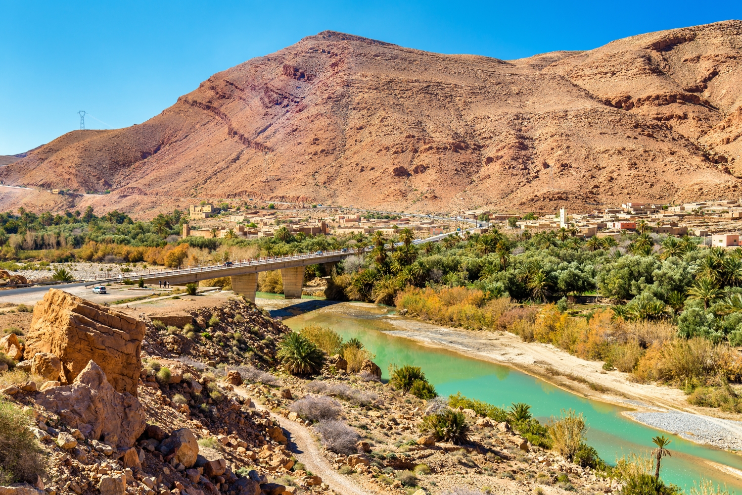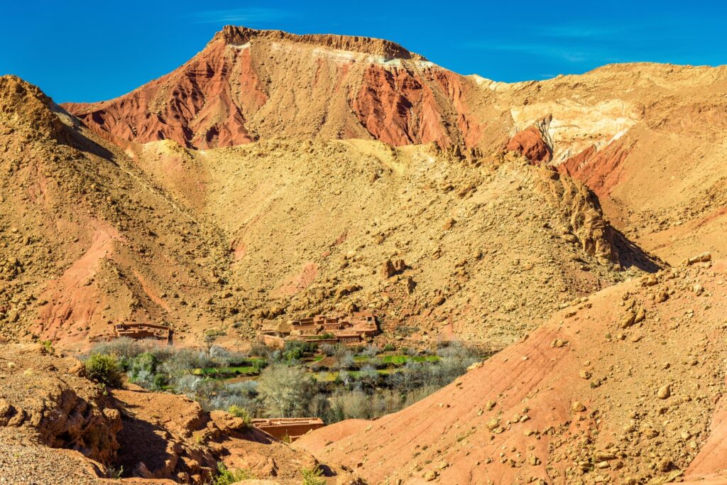 A dirt road leads alongside the river on a gentle walk down to the end of the trek. Occasionally the route does climb a little before it reaches the beautiful little village of Fakhour, where the houses climb up the hillside and noted for its agadir, which can be visited. There’s no entry fee, but the gardien should be tipped (Dh10 would be welcomed).