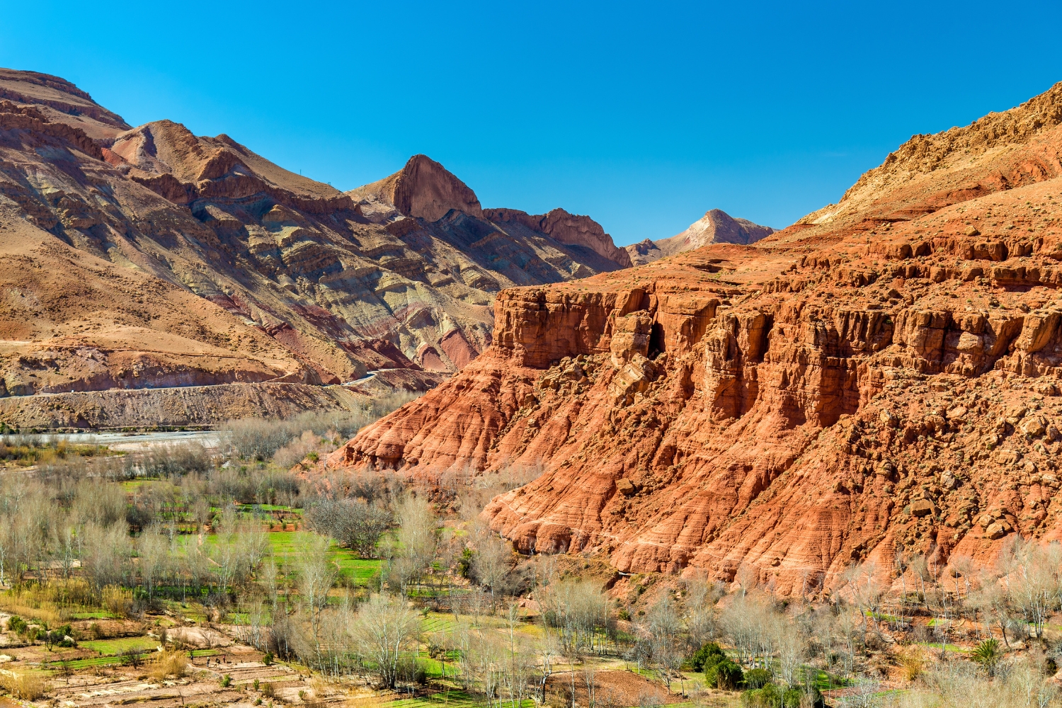 The river has little or no fish since a large flood flushed them out a few years back, but it does irrigate some exceptionally fertile farmland which the Berbers, here of the Ait Atta tribe, use to grow a range of seasonal crops. In the spring, the valleys are carpeted with wild flowers, while the fruit and nut trees add their blossom to the spectacle. In this part of its course, the Tessaout flows more or less due west and is fed by a series of smaller streams that bring melted snow off the higher mountains.